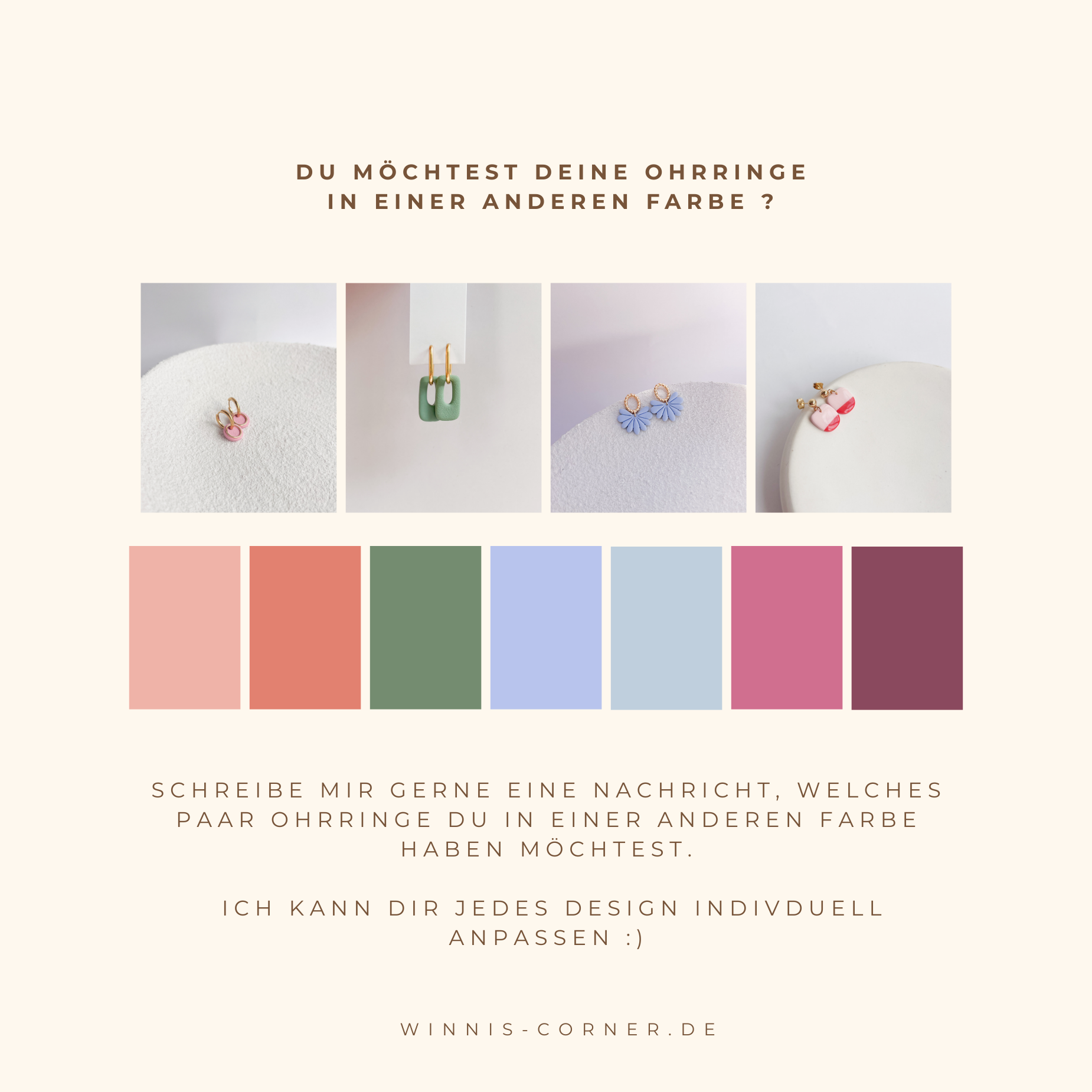 Lege Polymerton-Ohrringe nicht in die Sonne. Bewahre sie am Besten in einer Schmuckdose oder in Winni's mitgeliefertem Schmuckbeutel auf. Vermeide Kontakt mit Flüssigkeiten und Kosmetika (Cremes, Parfüms, Seifen). Reinige sie bei Verschmutzung mit einem feuchten Mikrofasertuch.