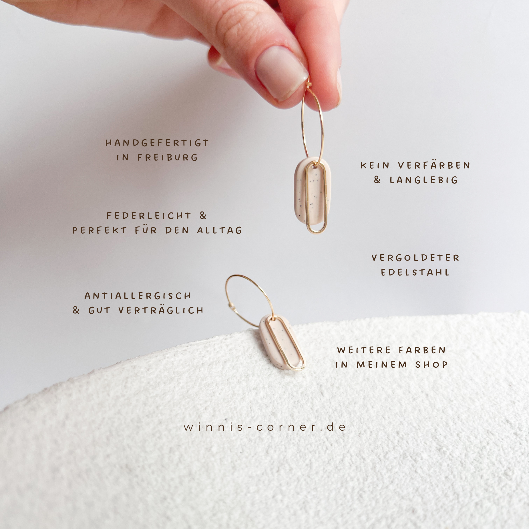 - Der Schmuck besteht aus antiallergischem, vergoldetem Edelstahl und leichtem Polymerton, einer ofenhärtenden Modelliermasse.