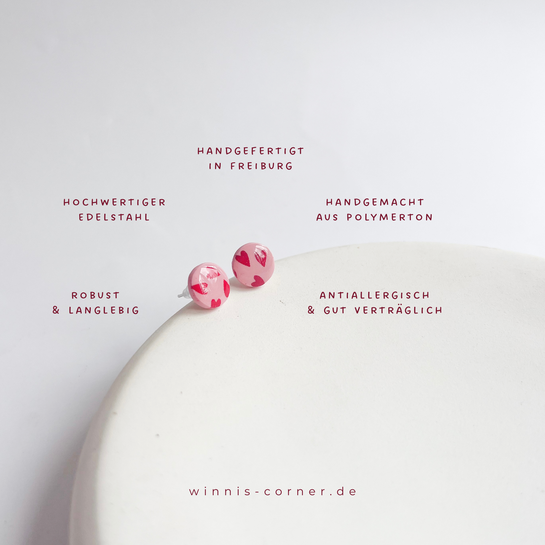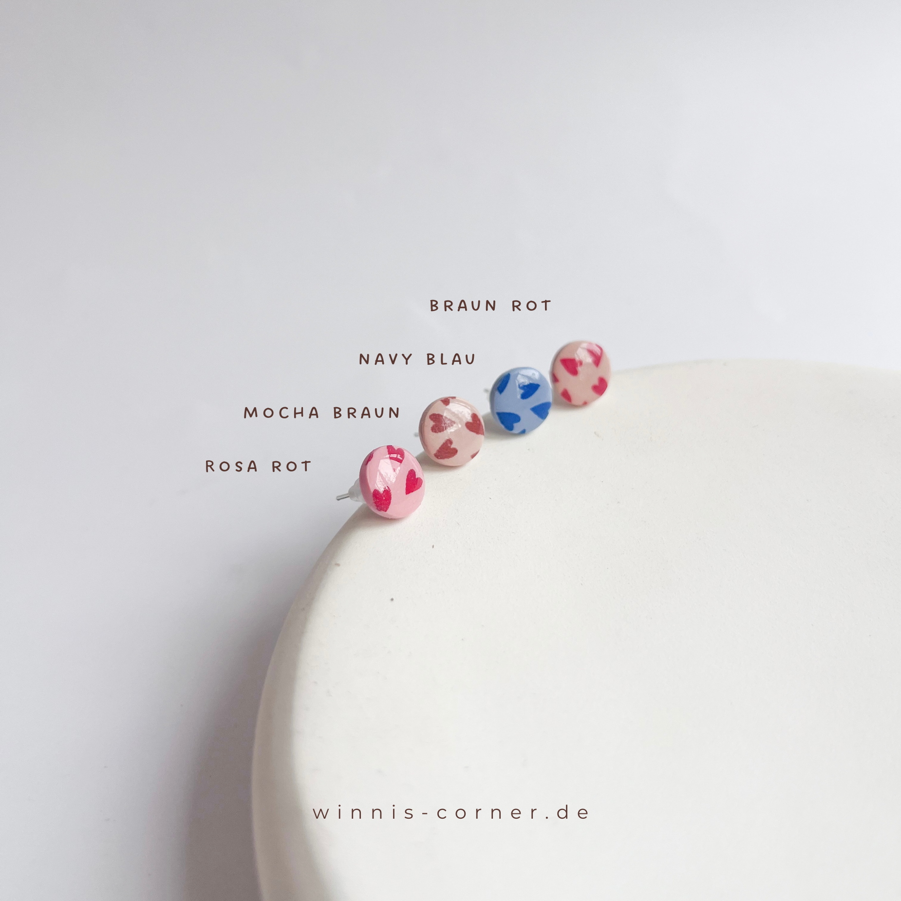 Lege Polymerton-Ohrringe nicht in die Sonne. Bewahre sie am Besten in einer Schmuckdose oder in Winni's mitgeliefertem Schmuckbeutel auf. Vermeide Kontakt mit Flüssigkeiten und Kosmetika (Cremes, Parfüms, Seifen). Reinige sie bei Verschmutzung mit einem feuchten Mikrofasertuch.